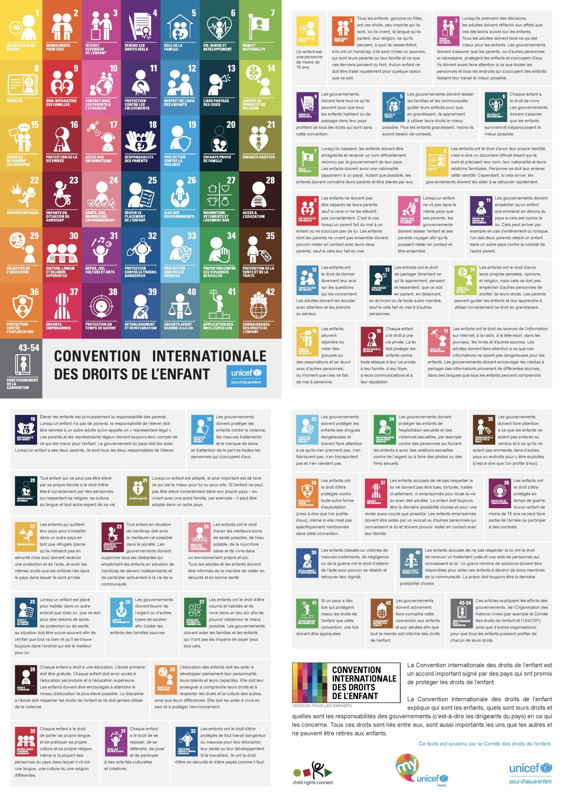 54 articles définissent les droits de l’enfant, structurés autour des thèmes suivants :